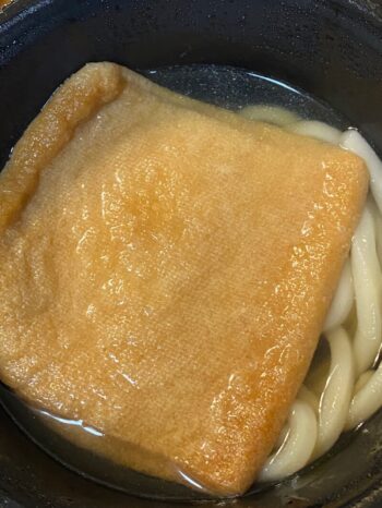 きつねうどんのきつねは、うどんが隠れるくらいの大判。