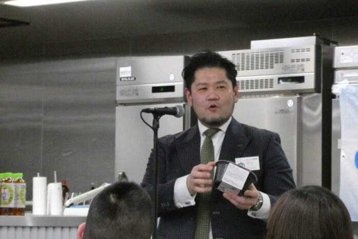2月の表彰式でプレゼンテーションした山田康介社長です。「お子さんが一人で調理しても安全に」となんど優しい開発姿勢。