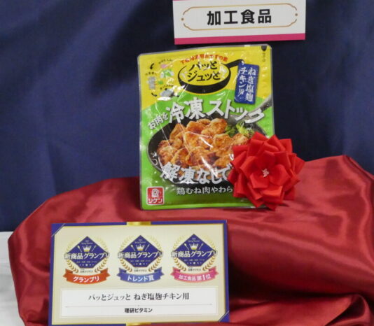 新商品グランプリに輝いた商品、理研ビタミンの「パッとジュッとねぎ塩麹チキン用」です。『冷凍ストック』と大きく書いてありますが、冷凍食品ではありません。このパッケージに鶏むね肉を入れて、冷凍庫へ入れてストック。冷凍庫から取り出してそのまま解凍不要でジュッとフライパンで焼けて、むね肉もしっとりとしておいしい、という商品です。