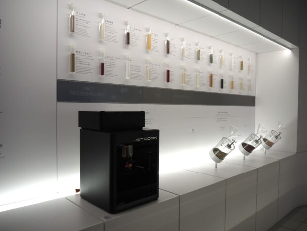「進化する冷凍食」として紹介するのは、凍結粉砕含水ゲル状粉末にした食品を長期保存し、食べる時に3Dフードプリンターで再生する技術。