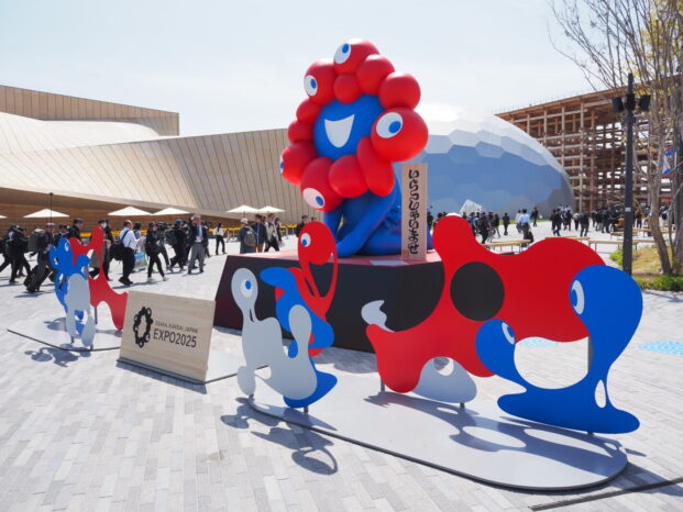 いよいよ、3月13日に開幕が迫っている大阪・関西万博(2025年日本国際博覧会)。初日の天候が心配ですが、開会に先駈けて実施した4月9日、プレスデーは快晴。夢洲(ゆめしま)駅から来る来場者が東ゲートを入ると、出迎えてくれるのは公式キャラクター、ミャクミャクです。細胞と水で生まれた生き物、という設定です。周りにいるのは「コミャク」。これも人気者です。