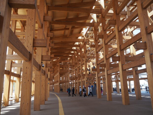 国産のスギやヒノキ、外国産のオウシュウアカマツを使用しているとのことで、時折よい香りがしてきます。この大きなリングの内外に、さまざまなテーマを持つパビリオン、世界各国(158カ国・地域,