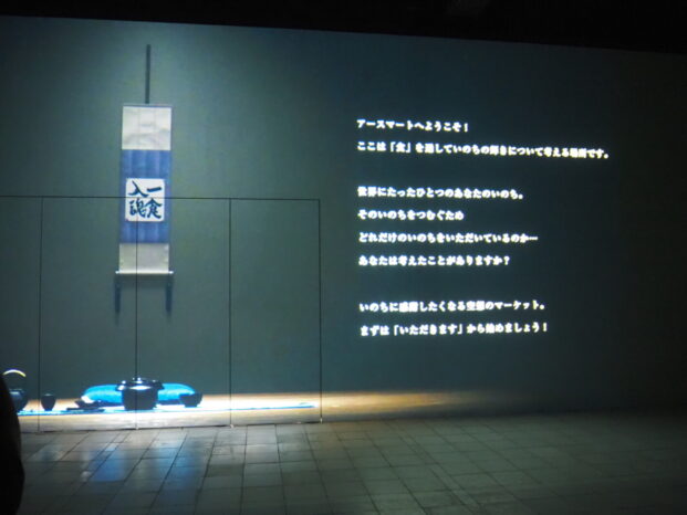 パビリオンの最初は「いただきます」から。松本潤さんが画面に現われ、かまど炊きのご飯をよそい、「いただきます」と言っておいしそうに食べます。