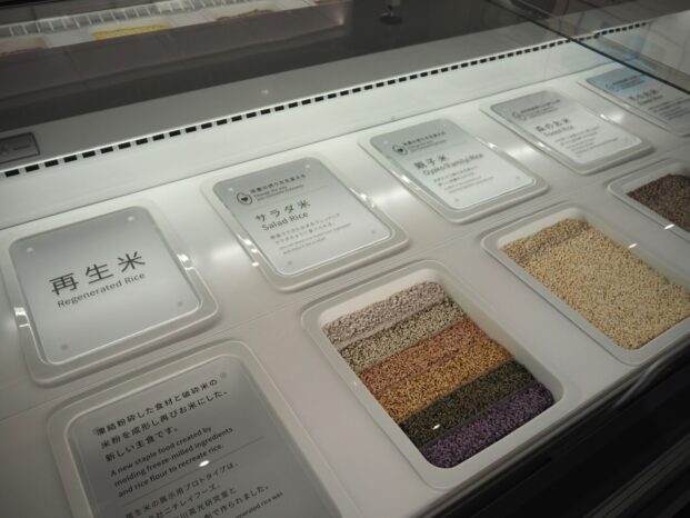 ニチレイフーズが協賛し展示したのは、「再生米」。凍結粉砕した食材と破砕米を米粉にしたものを組合わせて米粒状にした「再生米」は、食品ロスを削減しながら、米飯メニューのバラエティを広げます。「テラスニチレイ」では、プロテイン粉を使った再生米を使用した、たんぱく質たっぷりの炒飯を提供します。
