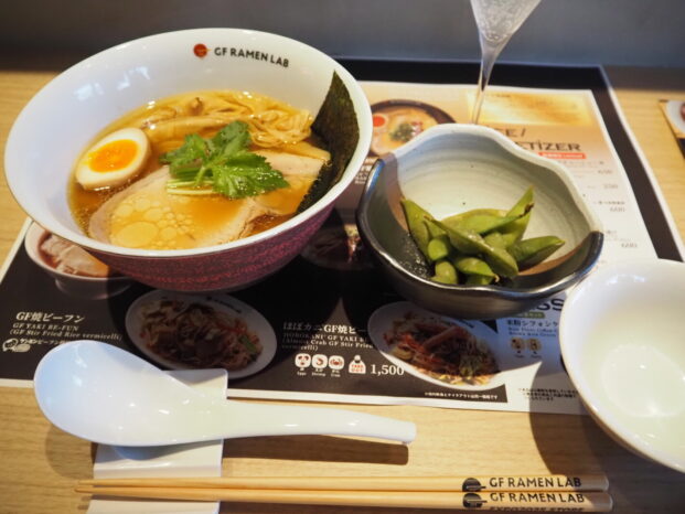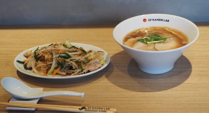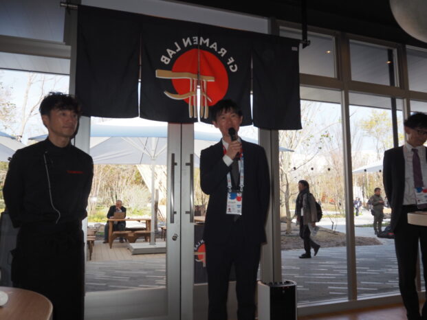GFラーメンは乾麺ですのでゆで時間が6分。1日の営業で500食提供がMAXとみているそうです。驚いたトピックスは、オープン3カ月後くらいをめどに、麺をより本当のラーメンに近づけた改良をする予定だということ。おいしいグルテンフリーラーメンの開発研究プロジェクトは、今回で完成ではなく、万博会期中も進行していくそうです。