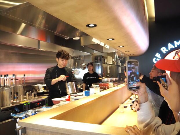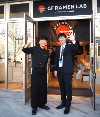 4月13日から始まる大阪・関西万博会場内で、グルテンフリーラーメンを提供するケンミン食品(本社:兵庫県神戸市)のレストラン「GF RAMEN LAB 大阪・関西万博店」特設サイト「米粉ラーメン革命』前で、高村祐輝社長㊨と、アメリカ・ボストンの人気ラーメン店「TSURUMEN」店主、大西益央氏㊧です。