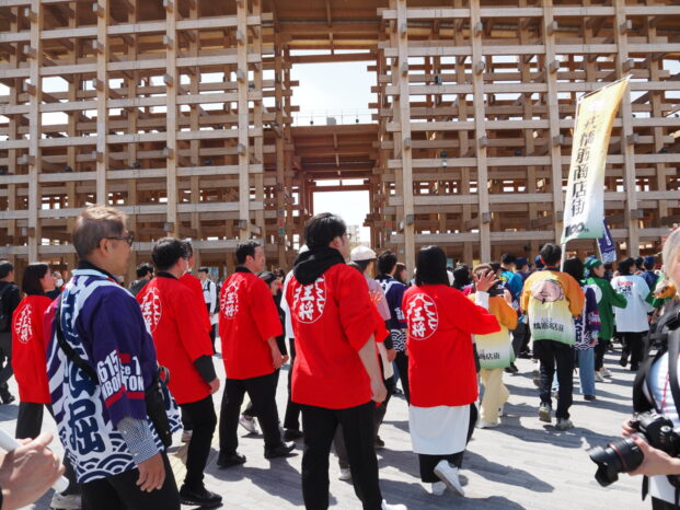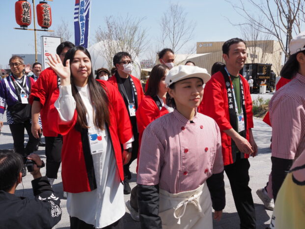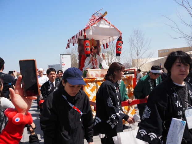 「大阪・関西万博」のプレスデー(4/9)、いざ大屋根リングへと勇んで歩き出したら、賑やかな集団の中に見慣れた大阪王将の真っ赤な法被姿の方々。イートアンドグループ・大阪王将(外食事業)が出店するフードコート「大阪のれんめぐり~食と祭EXPO~」関係者による商売繁盛・万博大成功祈願の「宝恵駕行列(ほえかごぎょうれつ)」でした。大阪ミナミ、今宮戎神社の伝統行事の再現です。