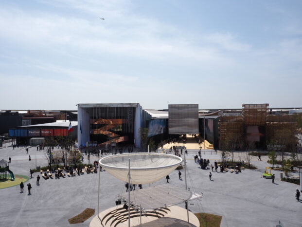右から、フィリピン、アメリカ、フランス。日本を除く158カ国・地域はリング内とのことで、分断、紛争、戦争の時代に開かれる万博だということに、改めて思いが至ります。