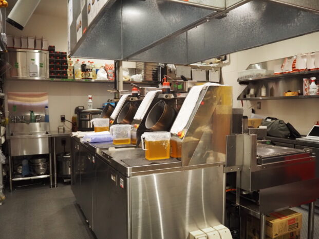炒飯を作る炒め調理ロボットは、「I-Robo2」が3台。炒飯を炒めるロボットという点では、図らずもニチレイフーズの「テラスニチレイ」(静けさの森)のコンセプトと重なりましたが、同ロボットのTechMagic㈱によると、ご飯を入れて調理する大阪王将と、冷凍炒飯を調理するニチレイとでは、同じ機械でも全く別のプログラムになるそうです。