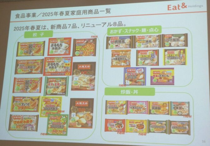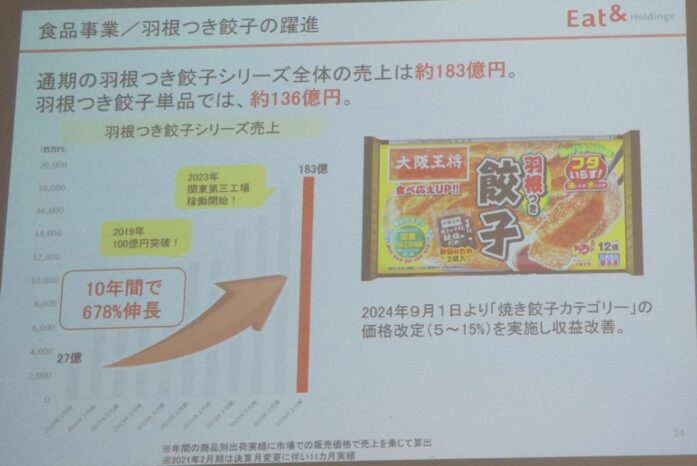 イートアンドホールディングスは4月11日、2025年2月期決算説明記者会見を東品川の東京ヘッドオフィスで開催、仲田浩康社長が概要説明、今年度方針を語りました。その中で仲田社長は、「大阪王将」ブランド家庭用冷凍食品を主軸とした食品事業について、「冷凍餃子カテゴリーにおいて高いシェアを維持して2年連続首位(インテージSCI〔15-79歳〕2024年3月~2025年2月:焼き餃子、水餃子市場購買金額シェア36.2%)となりました。通期の羽根つき餃子シリーズ全体の売上は約183億円で、10年間で678%伸長。羽根つき餃子単品では約136億円です」と好調ぶりを披露。昨年9月に実施した価格改定で収益も改善したとしました。