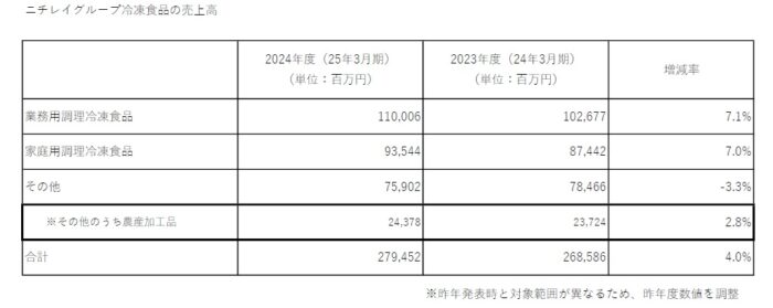 ニチレイは、2025年3月期のニチレイグループ冷凍食品売上について、2794億5200万円、前期比4.0%増と発表しました。