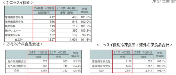 同社2024年度決算発表によると、ニッスイ個別業績での家庭用冷凍食品調理冷凍食品は、売上高412億円で前年比101.6%。カテゴリー別では、「焼きおにぎり」発売35周年キャンペーンを展開したおにぎり類107%、「ちゃんぽん」をはじめとする冷凍麺類105%。主食に近いスナック商品としてたこ焼き類も受けて117%でした。