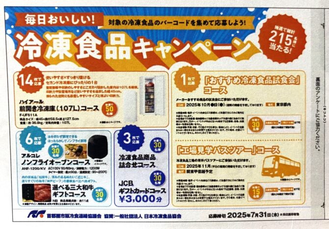 市販用冷凍食品のパッケージに印刷されているバーコードを集めて送ると当たる景品の目玉は、セカンド冷凍庫。なんと、50名様にプレゼント。