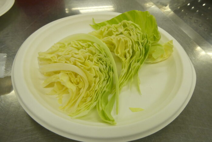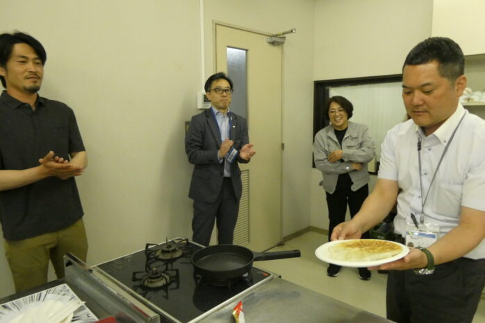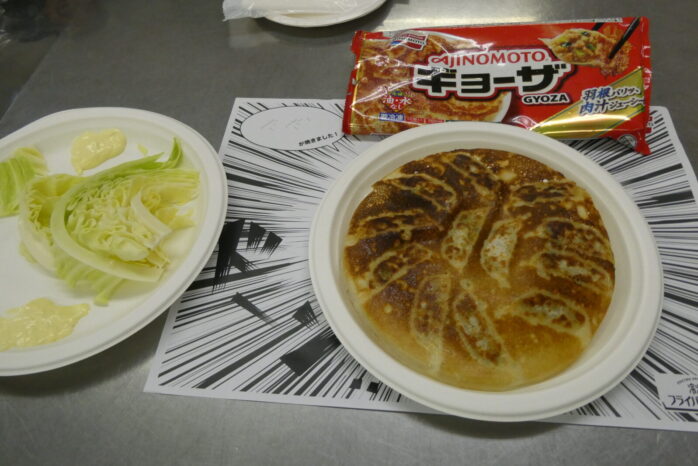 発表会出席者による「AJINOMOTOギョーザ」の焼き体験を行い、また、当日朝に立久井農園で主格したキャベツの試食も行いました。