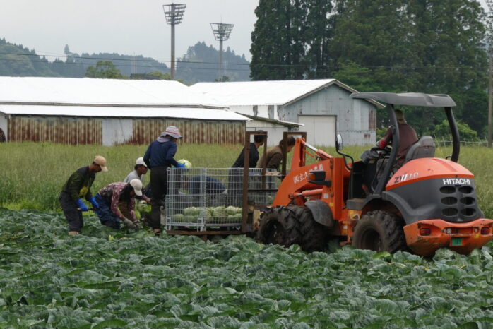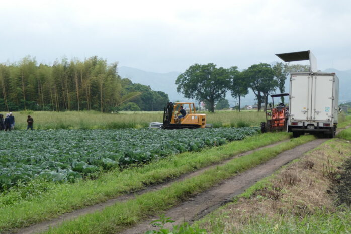 続いて、立久井農園の圃場に行き、1つひとつ丁寧にキャベツ収穫する風景を見学。