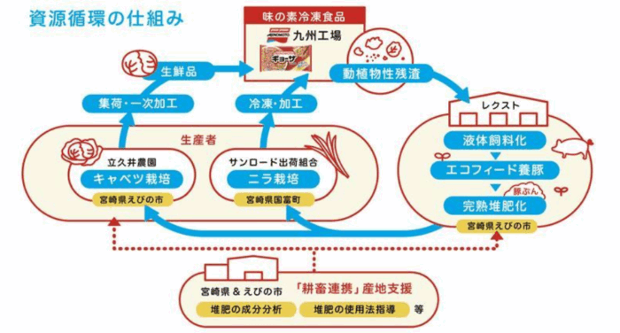 その実践第一弾は、宮崎県の生産者、行政との連携でスタートします。上図の通り、「AJINOMOTOギョーザ」を製造している九州工場(佐賀市)から出る動植物性残渣(キャベツの芯、形が崩れ製品化できないギョーザなど)が、養豚事業者の飼料の一部になり、その豚ぷんが完熟堆肥化され(宮城県えびの市の㈱レクスト)、キャベツ栽培(えびの市の㈱立久井農園)、ニラ栽培(宮城県東諸県郡国富町の㈱サンロード)に使用され、キャベツとニラが九州工場の「AJINOMOTOギョーザ」の原料になる、というサイクルがぐるぐる回って資源循環していきます。