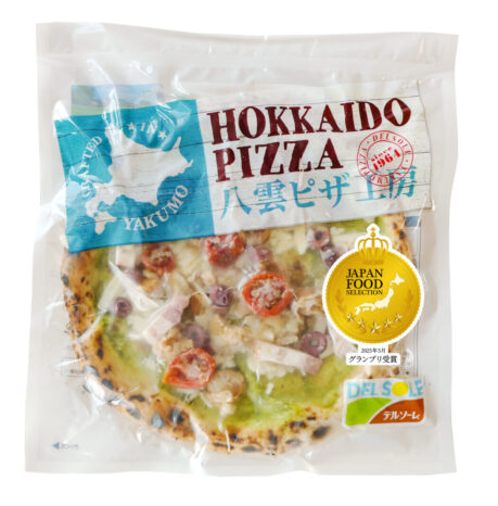 写真は、デルソーレの冷凍ピザ「HOKKAIDO PIZZA 噴火湾産ベビーホタテとホエー豚ベーコンのバジルピザ」です。ゴージャスなトッピング。生地も手のばしの本格派です。このピザがこのほど、一般社団法人フードアナリスト協会主催「ジャパン・フード・セレクション(2025年4月)」で、最高位の『グランプリ』を受賞しました。
