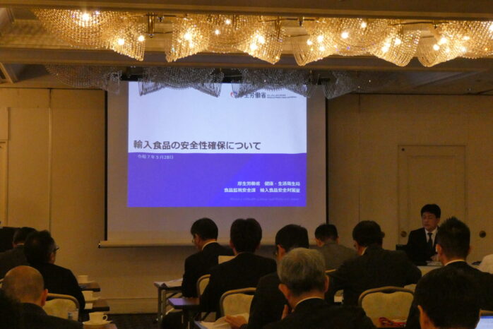 総会終了後は引き続いて、厚生労働省健康・生活衛生局食品監視安全課輸入食品安全対策室の矢川雅崇専門官、長久保直也係員を講師に迎えた講演会、「輸入食品の安全性確保について」と輸出国の衛生確保対策をレポートした「輸入食品の安全性確保の取組み」を開催しました。