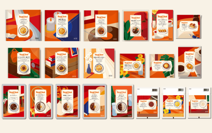 新ブランドのデザイン、コンセプトを担当したのは、徳田祐司氏(㈱カナリア代表取締役)。徳田氏は、「ロイヤルホストは高級レストランではなく、手軽に、ゆったりできる素敵な空間。“普段を豊かに”してくれるレストランだと考えました。物販も普段を豊かにしてくれることを伝えるように」デザインした、とのこと。商品ごとにさまざまなパッケージになっていて、統一イメージのベースは、豊かなダイニング空間をイメージしたイラストだそうです。