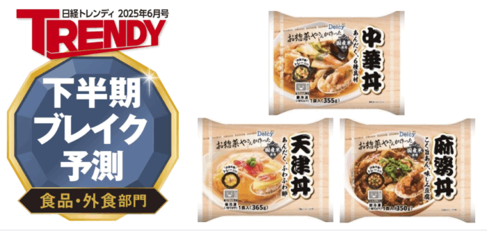 日本アクセスは、同社『Delcy』ブランドで今春発売した冷凍食品新商品、「Delcy中華丼/天津丼/麻婆丼」の3品が、『日経トレンディ』誌2025年6月号の2025 年上半期ヒット大賞&下半期ブレイク予測企画で、『下半期ブレイク予測 食品・外食部門』を受賞したことをニュース発信しました。