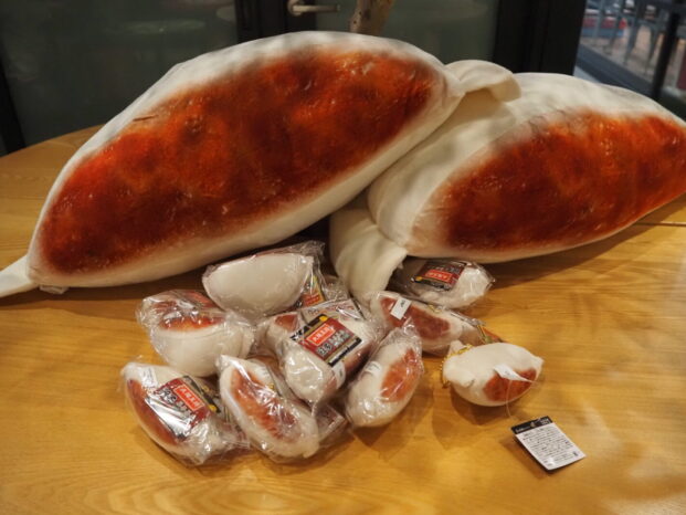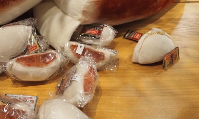 焼きめがついていて、「ひとつ折りのヒダ」は、外食の「大阪王将」餃子を再現しています。そして、引っ張るとブルブルする引き手には、「羽根つき餃子」のパッケージ(プラスチックで再現)。大型景品の「大阪王将餃子クッション」もふわふわで好評でした。