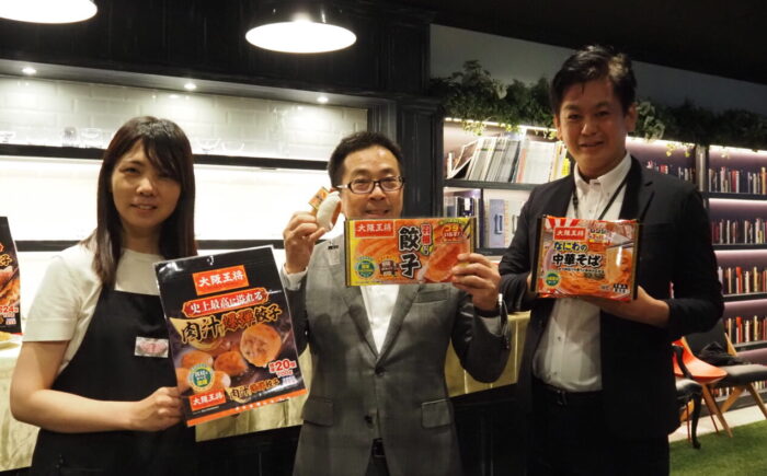 「お値段と価値をバランスよく。生活者の皆さまにご納得いただけるよう工夫しています」と語ったイートアンドフーズ山本専務(写真㊥)が、リニューアルした「羽根つき餃子」と一緒に持っているのは、ゲームセンターの景品に採用された「大阪王将餃子マスコット」。