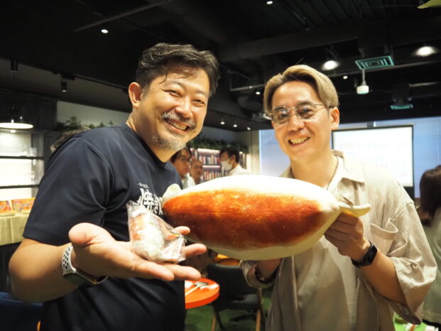焼き餃子協会代表の小野寺力さん㊧、冷食番長こと冷凍食品マイスターのタケムラダイさん㊨もにっこり。