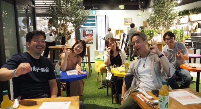 家庭用冷凍食品の2025年新商品発表会の第一弾、イートアンドフーズの新商品発表会で、おなじみインフルエンサーのみなさまと「冷食OK!」。【前列㊧一般社団法人焼き餃子協会代表理事 小野寺力さん、同㊨冷凍食品マイスター:冷食番長タケムラダイさん、後列㊧管理栄養士・エミッシュ代表 柴田真希さん、同㊥スーパーエコごはん研究家 桃世真弓さん、同㊨ラーメンライター 井手隊長さん】