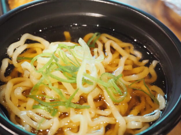 「大阪王将」のお店の味わいを研究し、そこに関西の食文化である出汁をきかせ、華やかな香りのこいくち醤油とコクのあるたまり醤油を使い、ネギ油で香りを出したスープ。スープがよく絡む、中太のちぢれ麺。麺は180gと満足感があるボリューム。具材はネギのみです。