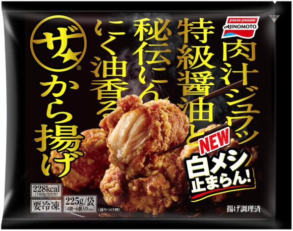 「ザ★」〈から揚げ〉(225g、4~6個入)は、食欲をそそる醤油の香りを立たせ、にんにくの配合を見直すことで、白メシがすすみ、何個でも食べたくなるから揚げに進化します。