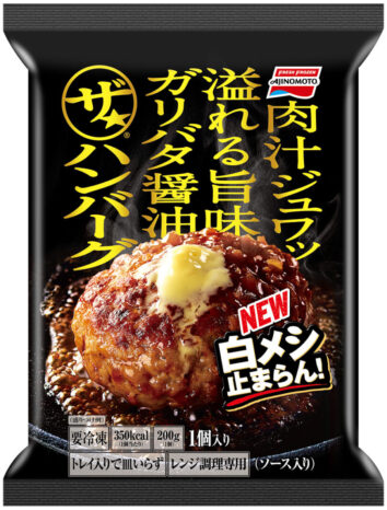そのシリーズ発売10周年にあたり、さらに幅広いユーザー獲得を狙って、同社は「ザ★」〈から揚げ〉と「ザ★」〈ハンバーグ〉をリニューアルします。パッケージに書いてある通り、『白メシ止まらん!』商品に進化。