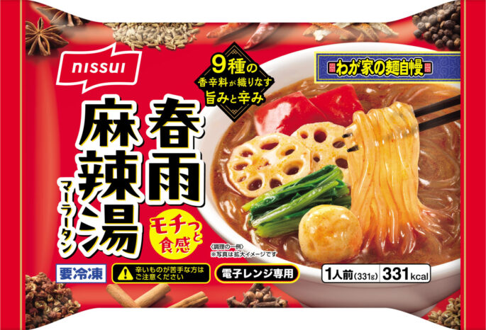 ニッスイの2025年秋冬新商品で、外食のブームをとらえた麻辣湯(マーラータン)メニューが登場します。「わが家の麺自慢 春雨麻辣湯」(1人前:331g)です。9月1日全国発売。