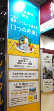 事業を展開するのは、冷凍食品宅配事業で50年以上の実績を誇る、SL Creations(エスエルクリエイションズ:以下SLC、本社・東京都大田区、佐藤健社長)。『O.P.F』はサービス展開8年目になりますが、オフィスに設置した冷凍庫は既に全国2600台を超えました。写真は6月に東京ビッグサイトで開催された「健康経営EXPO」の展示ブースですが、連日注目を集めて大賑わいでした。