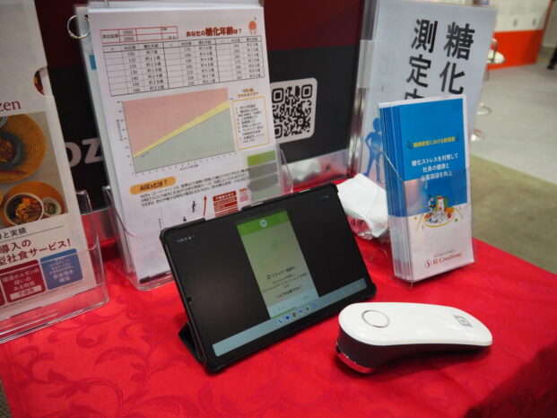 今回の展示ブースで関心を呼んだのが、「糖化年齢」の測定コーナーでした。測定できるのは「AGEs(エージーイー:終末糖化産物)」です。AGEsは、加齢と共に体内に生成される老化物質の一つですが、糖質や脂質の摂り過ぎにより、実年齢レベルより増加します。測定した方々、実年齢との差に一喜一憂といったところでした。
