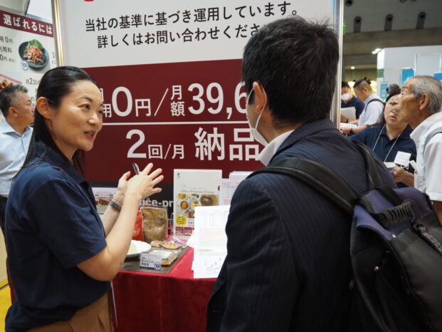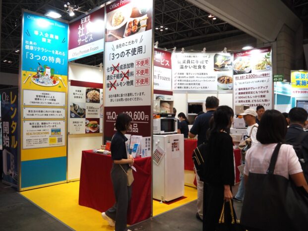 展示会場では、様々なオフィス向けの食品・食事提供サービスが紹介されていましたが、それらの導入を検討しながら比較して見て回っている来場者が多いようでした。従業員の昼食問題解決は、中小企業の大きな課題のようです。