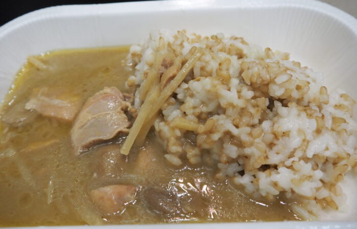 「発芽玄米ごはん」と8月発売予定の「タイ風マイルドグリーンカレー」を試食いたしました。合わせて200円のグリーンカレーライス。 食べ応え、おいしさ、お買い得感で満点です。