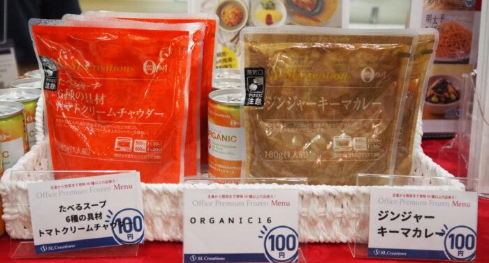 常温品の品揃えも充実しています。パックごはん、レトルトカレーという人気商品に、スタンディングパウチ入りの「食べるスープ 6種の具材トマトクリームチャウダー」や「ジンジャーキーマカレー」が今年新たに追加。アスリートや著名人にもファンがいるオーガニック野菜・果物16種を使った「ORGANIC16」も100円です。