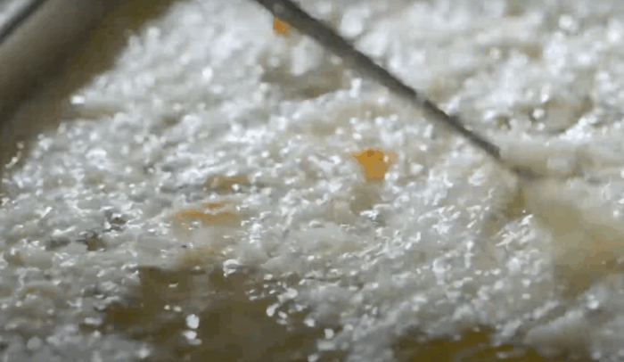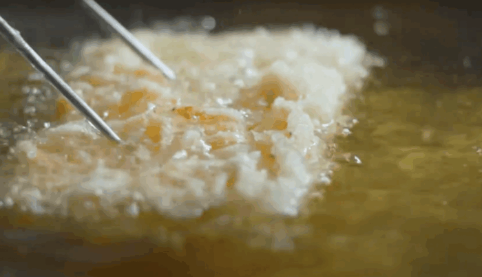今度は、溶き粉が揚がり切っちまう前に、それを鉄の箸で瞬時に真ん中にギュッと集めて、キレイな長方形に形作られて、しっかりかき揚げになってくじゃねぇか!?