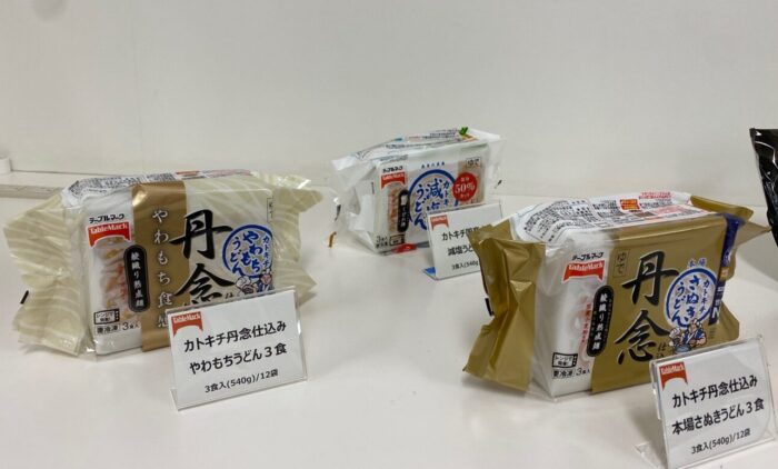 テーブルマークでは、既存品の“丹念シリーズ”「カトキチ丹念仕込み やわもちうどん 3食」と、「同 本場さぬきうどん 3食」もこの秋、リニューアルします。やわもちうどんは、配合の見直しによって、よりもちもち食感がアップします。本場さぬきうどんは、麺の形状をコンパクトにすることで、鍋に入れやすくしたリニューアルです。