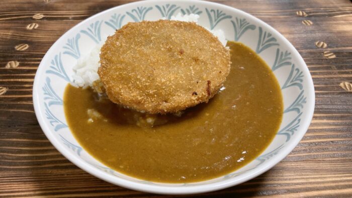 そのまま食っても当然うめぇが、このコロッケの甘みを最大限に活かすにはカレーのトッピングにしたら最高なんじゃねぇの?っつ〜ことで、やってみたぜ。