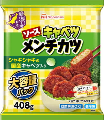 「キャベツメンチカツ VP」(408g)は、国産キャベツを使用したシャキシャキ食感が特徴のメンチカツ。りんごピューレ入りの自家製ソースがかかっています。