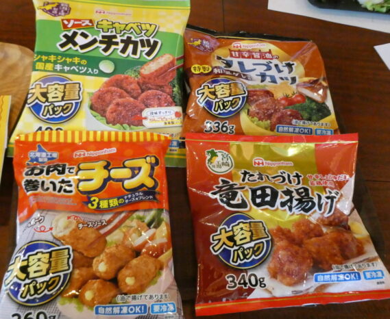 日本ハムブランドのお弁当用冷凍食品の中で、直近売れ筋1位の「キャベツメンチカツ」、同4位「たれづけ竜田揚げ」、同5位「お肉で巻いたチーズ」、春発売ながら同9位ランキングの「たれづけカツ」の4品です。いずれも自然解凍OK、レンジ調理ですぐ食べられます。