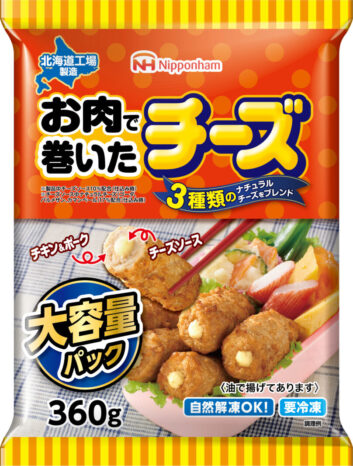 「お肉で巻いたチーズ VP」(360g)は、チキン&ポークのお肉でチーズソースを巻いた、同社のロングセラー人気商品。チーズソースは3種のナチュラルチーズ(ゴーダ・パルメザン・カマンベール)をブレンドしています。8月発売済。