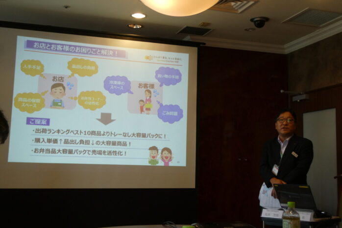 人気商品のボリュームパック品発売の狙いを語る営業企画開発部松本茂樹部長。節約志向に応えて、3~4パック分の大容量品でお得感を提供します。プラスチックトレイなしもゴミ削減につながり歓迎されそうです。販売店へも品出しの負担削減などのメリットを提供します。