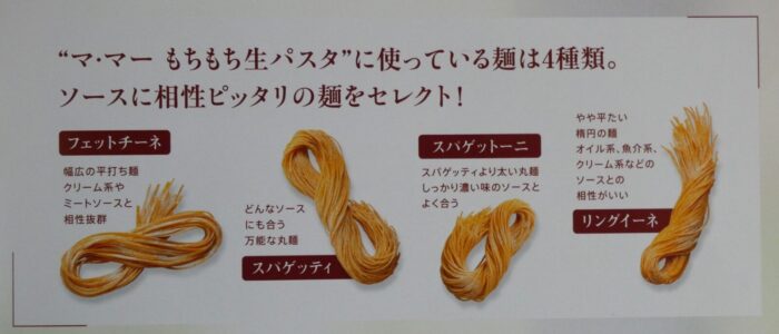 本当においしい、もちもちの生パスタとは何か?を追求した商品開発。行きついたのは、小麦粉等の最適なパランスでのブレンド、圧力をかけてギュッと押し出す本格製法、「外食店の生パスタ品質に近づいた」(物性を自社計測)としています。もう一つの注目ポイントは、メニューに合わせた形状の生パスタ4種類(フェットチーネ、スパゲッティ、スパゲットーニ、リングイーネ)用意したことですね。こだわり強めです。