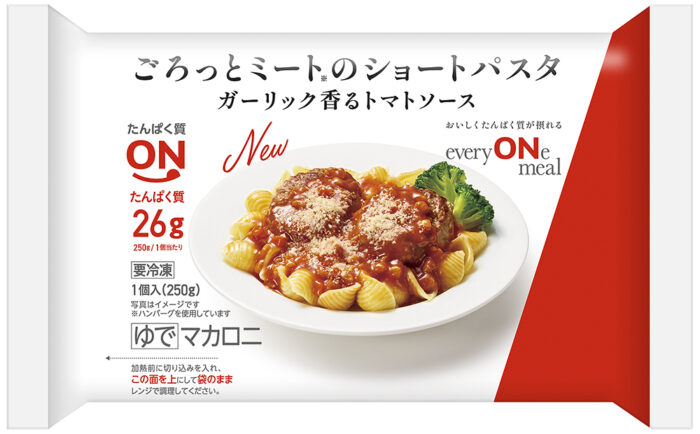 続いてのご紹介は、たんぱく質摂取をサポートすることがテーマのニチレイフーズ「エブリオンミール(everyONe meal)」シリーズから、「5種野菜のチーズビビンバ」と9月新発売商品を一足早く「ごろっとミートのショートパスタ」。
