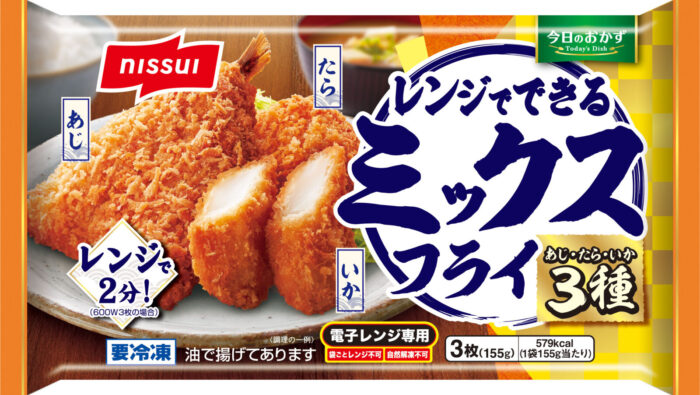 1回のレンジ(600Wで2分)で、あじフライ、たらフライ、いかフライの3品が仕上がる、ニッスイ「今日のおかず レンジでミックスフライ」。千切りキャベツ、ごはん、みそ汁などを揃えるだけでたんぱく質は軽く20g超。手軽にしっかり栄養が摂れるのが、冷凍食品の強さです。