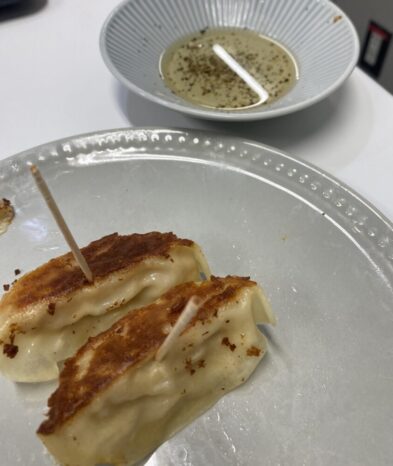料理上手な宮木亜希子ディレクターが、「餃子は酢こしょうが合います」というので試食してみたら、これがGood! たんぱく強め風味をうまく緩和しておいしく食べられました。スーさんにも大好評。