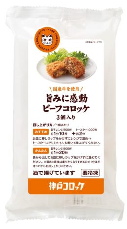 新商品もう1品は、「黒毛和牛のビーフコロッケ」の後継商品として発売した「神戸コロッケ 旨みに感動 ビーフコロッケ 3個入り」(180g、税込594円)です。