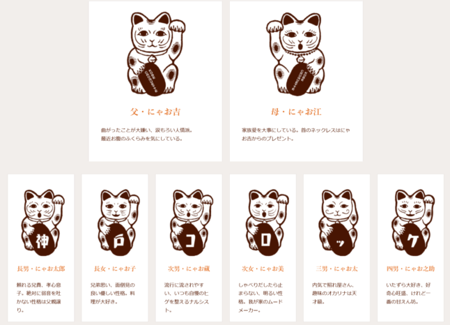 「招喜家」は、父・にゃお吉、母・にゃお江の夫婦に6匹の子猫で全8匹。この秋から、「神戸コロッケ」冷凍シリーズをPRするため、にゃお吉がカチンカチンに凍りついて「冷凍にゃんバサダー」に就任したそうです。